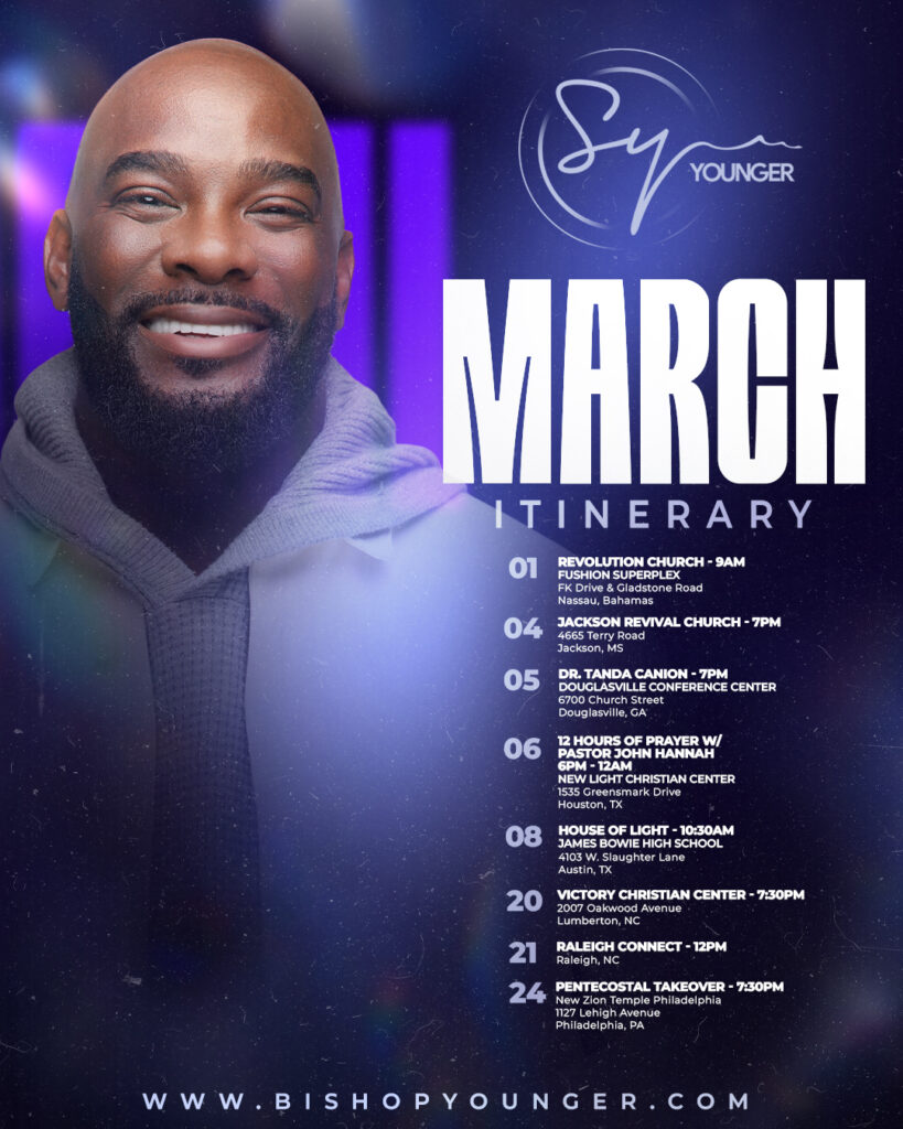 Bishop Younger is coming to your area! Come worship with us! We’re expecting a powerful move of God and a high time in the Lord!